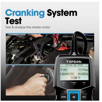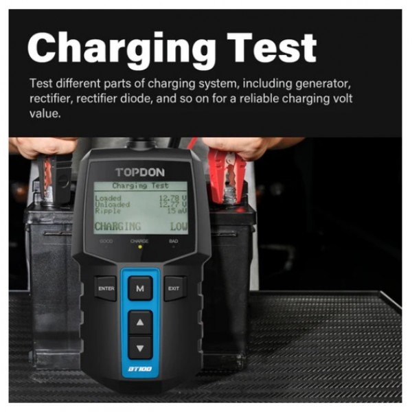 BT100 – tai TOPDON akumuliatorių testavimo įrenginys, leidžiantis greitai ir tiksliai įvertinti 12 V švino rūgšties akumuliatorių būklę. Prietaisas matuoja akumuliatoriaus būklę (SOH), įkrovos lygį (SOC), vidinę varžą ir realią startinę galią (CCA). Testeriu taip pat galima atlikti užvedimo (cranking) ir įkrovimo sistemos testus, įskaitant bangavimo (ripple) analizę.