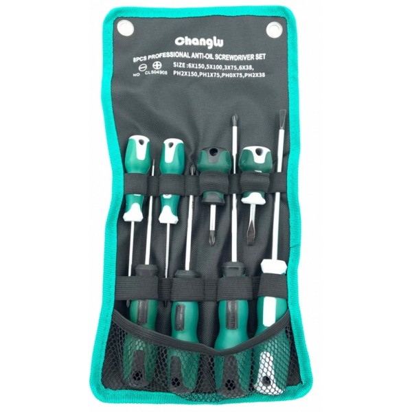 PH2 x 38 mm, PH0 x 75 mm, PH1 x 100 mm, PH2 x 150 mm Plokščias 6 x 38 mm, 3 x 75 mm, 5 x 100 mm, 6 x 150 mm CrV plienas Chromuotas Gumuota rankena