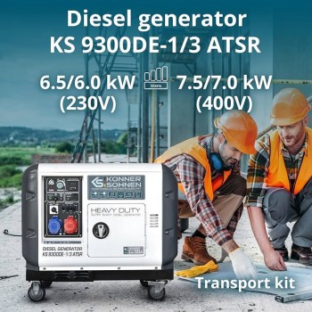 Praktišką generatoriaus dizainą papildo transportavimo komplektas su ratukais ir rankenomis, kad jį būtų galima lengva transportuoti, todėl Könner & Söhnen KS 9300DE-1/3 ATSR yra lankstus, efektyvus ir universalus pasirinkimas nepertraukiamam elektros energijos tiekimui.