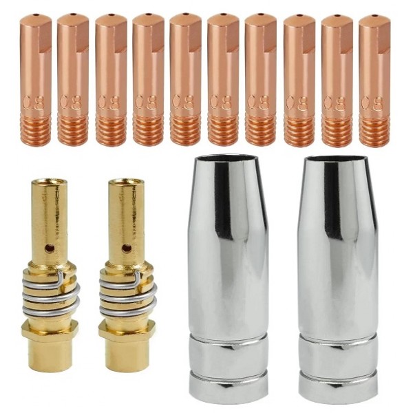 MIG15 degiklio dalių KOMPLEKTAS 2x Tūta F14 / F15 2x Jungiamoji dalis F15 su kairiąja spyruokle 10x Antgalis F14 / F15 (M6x25) - 0.8 mm