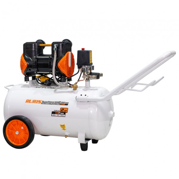 RURIS Silent Power 5000 Oil Free - tai patikimas, kompaktiškas ir itin tyliai veikiantis oro kompresorius, sukurtas darbui tiek buitiniam, tiek profesionaliam naudojimui, kur labai svarbus mažas triukšmo lygis. Dėl pažangios alyvos nenaudojančios technologijos (nereikia tepimo) šis kompresorius tiekia švarų suslėgtą orą, todėl puikiai tinka naudoti medicinos įstaigose, laboratorijose, elektronikos dirbtuvėse, automobilių servisuose ar net namuose. Alyvos nereikalaujantis variklis ne tik sumažina priežiūros kaštus, bet ir leidžia dirbti švariai, be teršalų bei nemalonių kvapų.